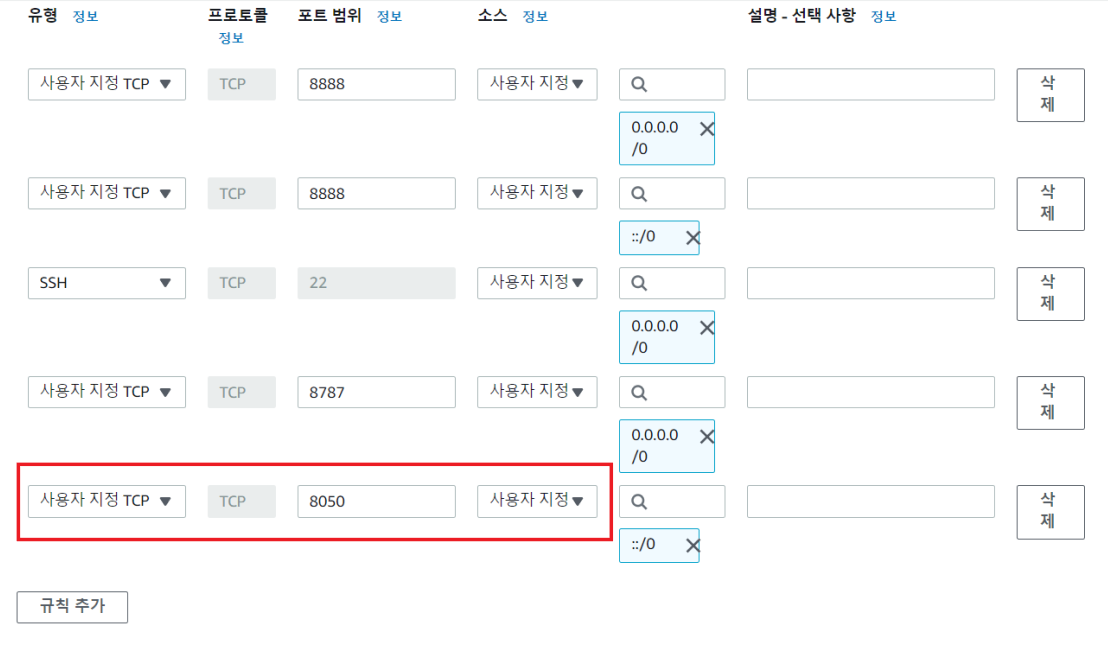 8050 포트 규칙 추가 및 사용자 지정 탭을 눌러 위치 무관으로 바꾸어 주어야 한다. (웹 배포의 목적)