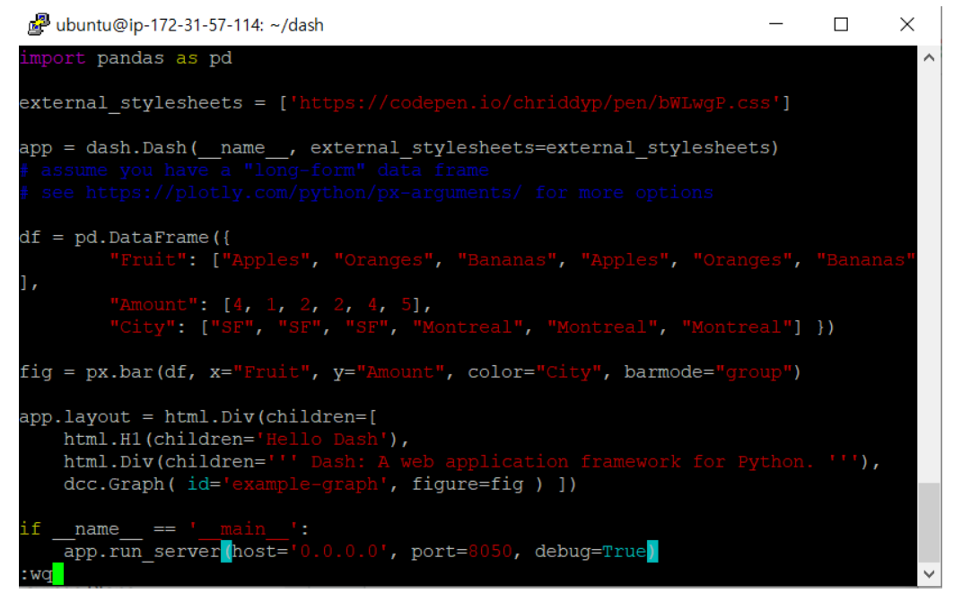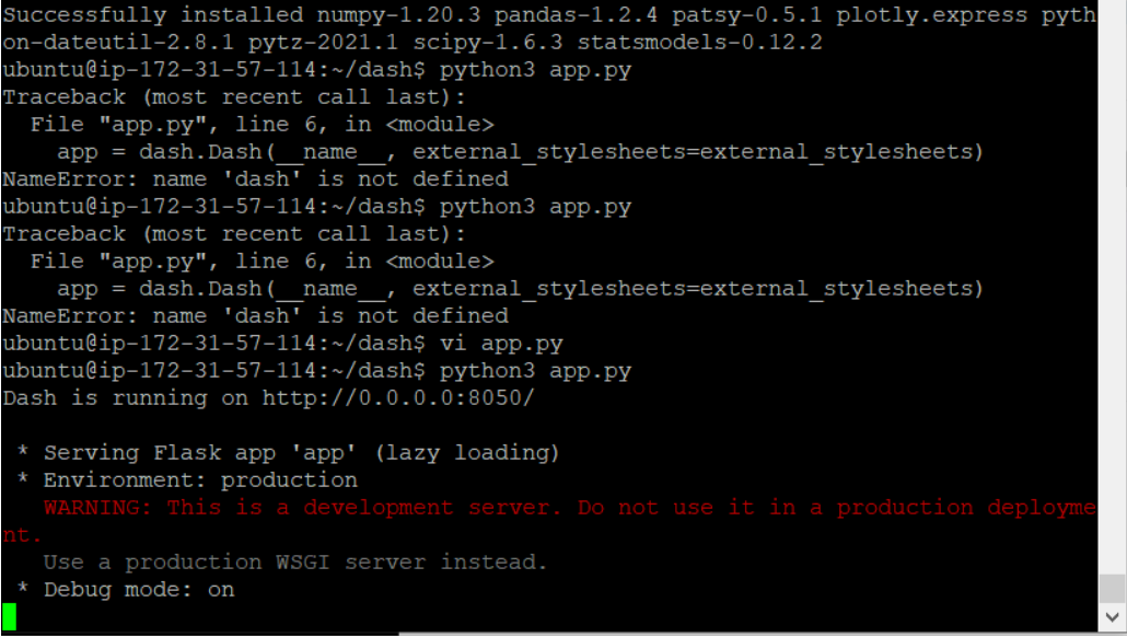 위에서 만들어 놓은 app.py를 통해 실행을 통해 잘 만들어져있는지 테스트를 해보자. 아래 코드를 입력하여 실행을 해주면 다음과 같은 메시지를 확인할 수 있다. 이를 확인하기 위해서는 웹 창에 EC2 IP:8050을 입력해주면 된다.